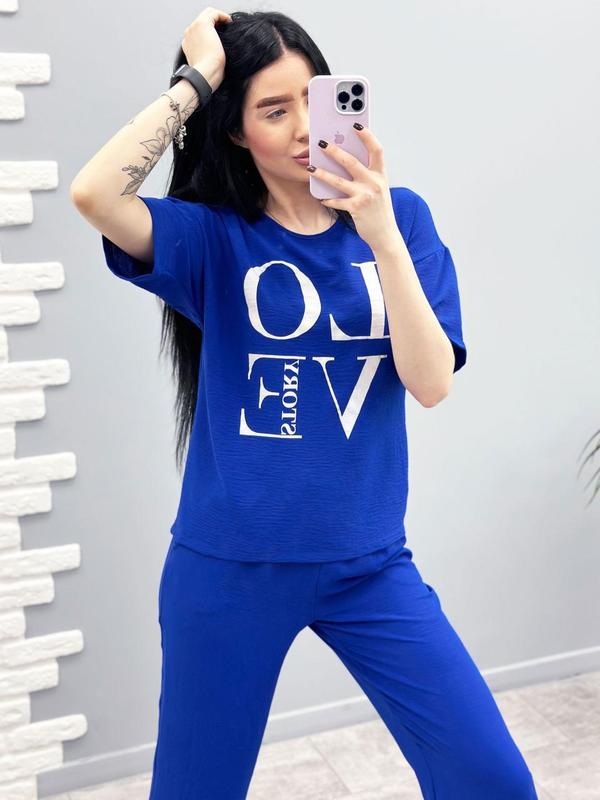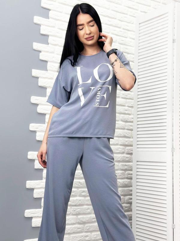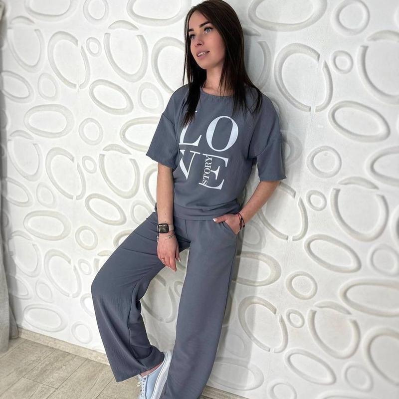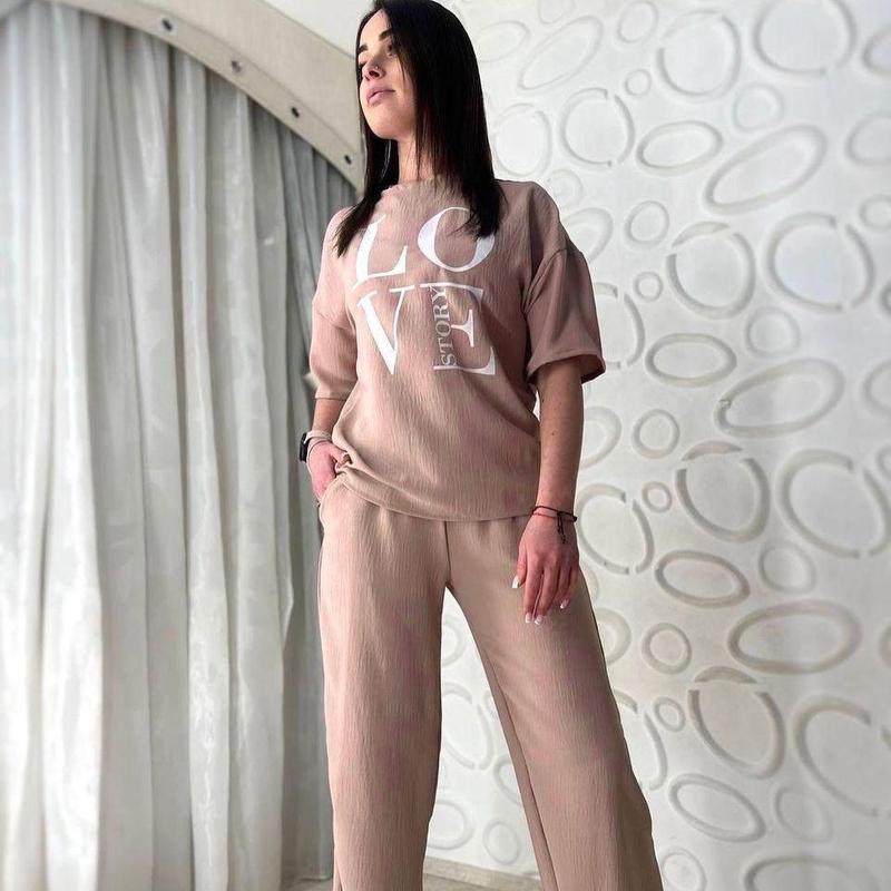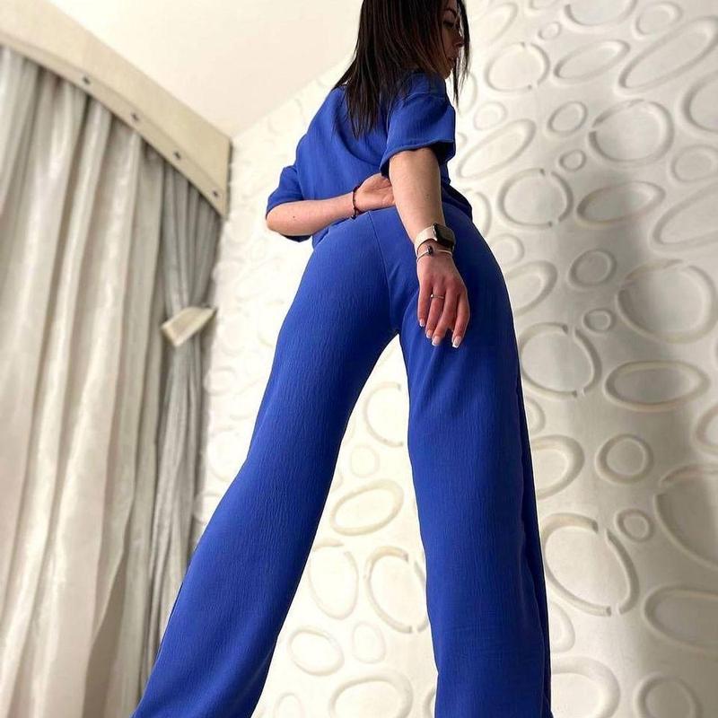 Летний костюм с широкими брюками изготовлен из жатого крепа. Благодаря