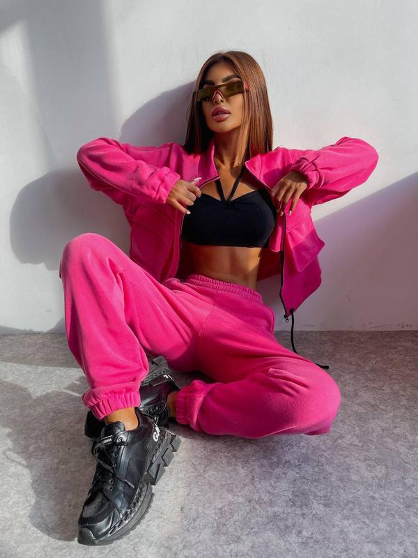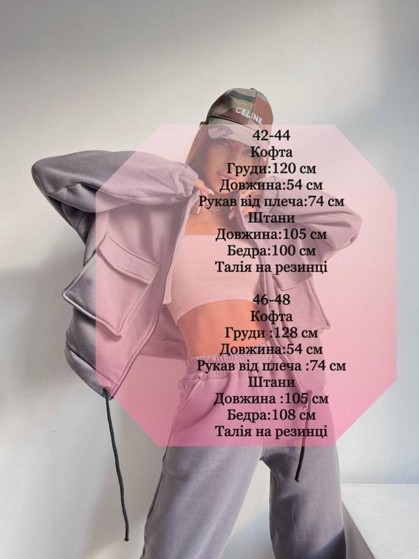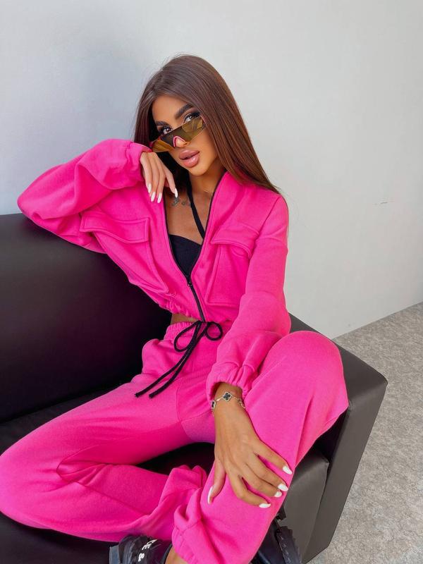 Стильный костюм из трехнити. Штаны на талии и внизу на резинке. Брюки с высокой посадкой. Кофта со стильными накладными карманами. Внизу затягивается на шнурок. Стильный и практичный костюм, в котором вы будете красиво смотреться.