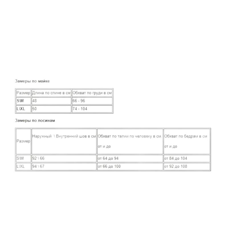 майке Размер Длина по спине в см Обхват по груди в см S\M 48 66 - 96 L\XL 50