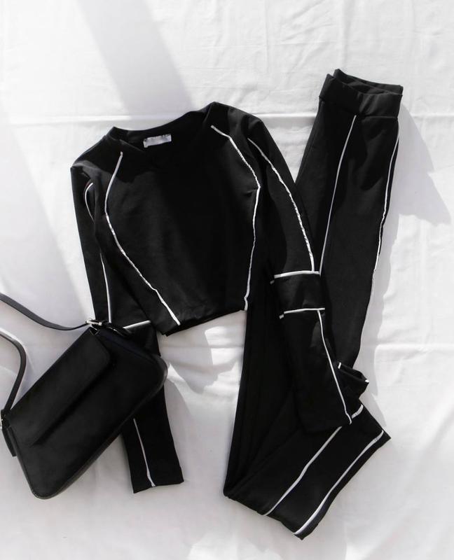 Черный спортивный фитнес костюм с белыми полосками🖤🤍Топ + лосини 🔘Размеры: 42-44, 46-48🔘Ткань: микродайвинг Удобный костюм из топа и лосин💫 Ткань приятная и хорошо тянется, садится по фигуре💖