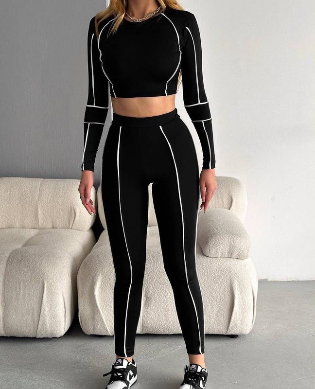 Черный спортивный фитнес костюм с белыми полосками🖤🤍 топ + лосини