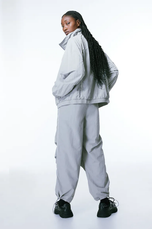 Нейлоновая ветровка свободного кроя с высоким воротником, молнией спереди и заниженной линией плеч. Незаметные карманы в боковых швах и потайная резинка на манжетах и по нижнему краю. Без подкладки.