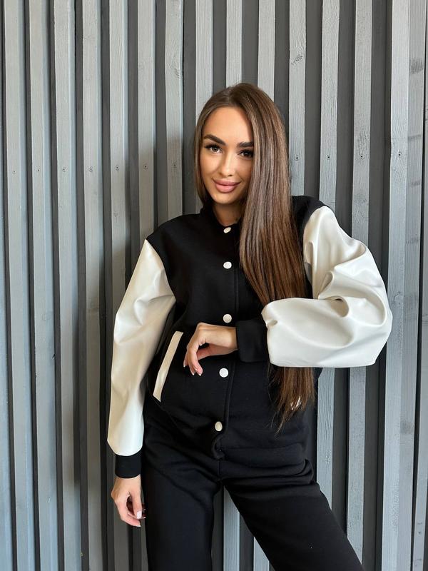 Рукава бомбера и манжет кармана выполнены из качественной эко кожи, что будет очень удобным в использовании, дорога фурнитура, высочайшее качество пошива 🔝