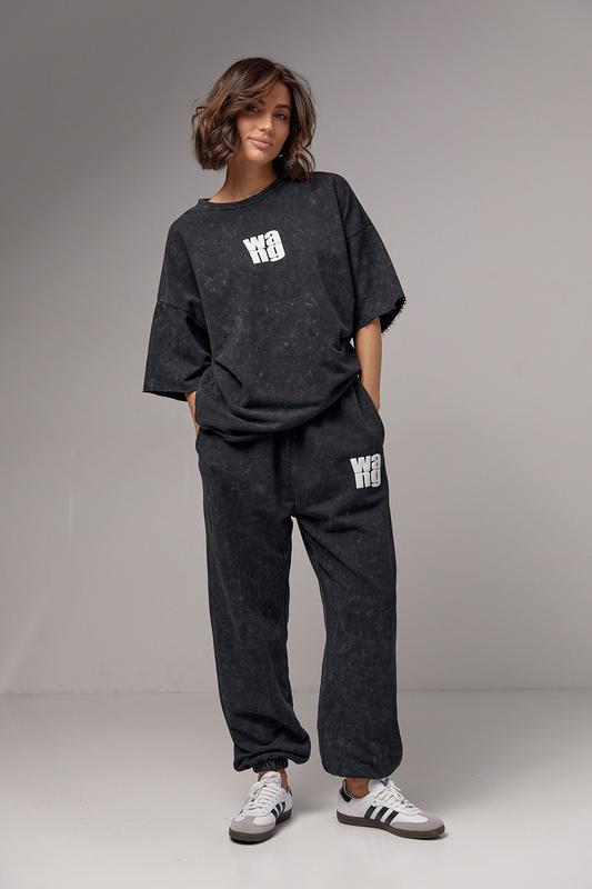 В этом комплекте свитшот в стиле оверсайз украшен спереди принтом Wang. В изделии края низа прямые, без манжет. Проймы опущенные, а четвертние рукава имеют необработанный край. Круглая горловина дополнена окантовкой в тон изделия. Штанишки к низу заужены, с прямыми краями на резинке. В поясе вшита широкая резинка, а спереди расположены прорезные кармашки.