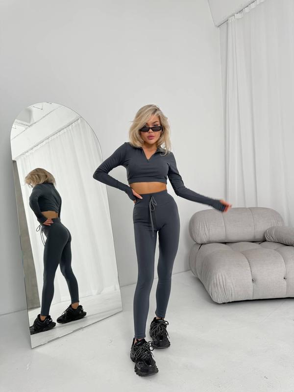 ⠀▫️Размеры: 42-44, 46-48▫️Тканина: рубчик▫️Цвета: черный, розовый, графит⠀Идеальный костюм: лосинки на резинке и завязках+лонгслив с молнией на декольте и прорезью для пальчика на рукаве.⠀Модель 128