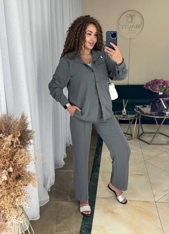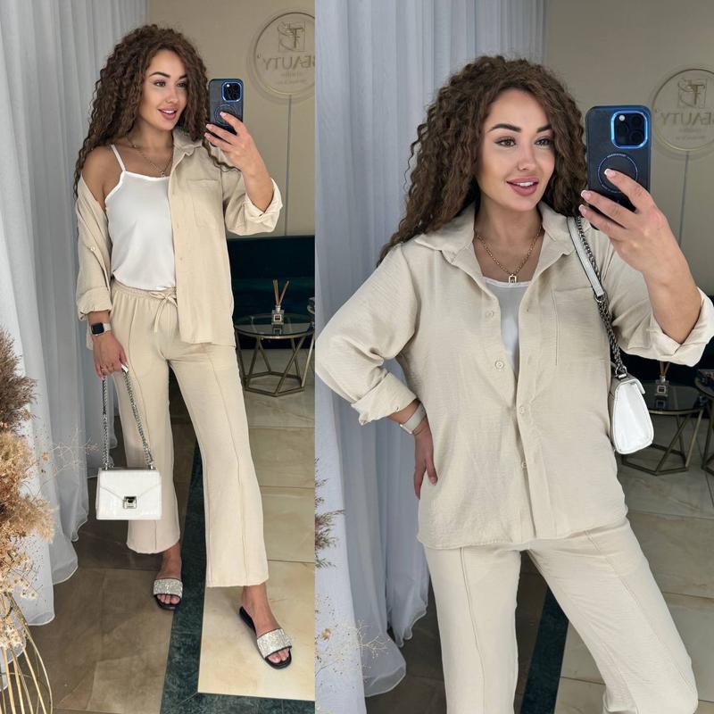Костюм тройкаРубашка + штани + майка Размеры: 42-44,46-48,50-52<unk>⠀ Ткань: американский жатый креп, майка софт Цвет: Графит, светлый беж, коричневый, травка, малина, неон- голубой Цена : 635 грн