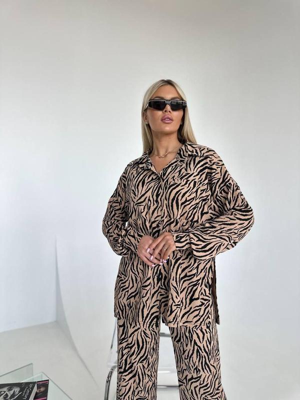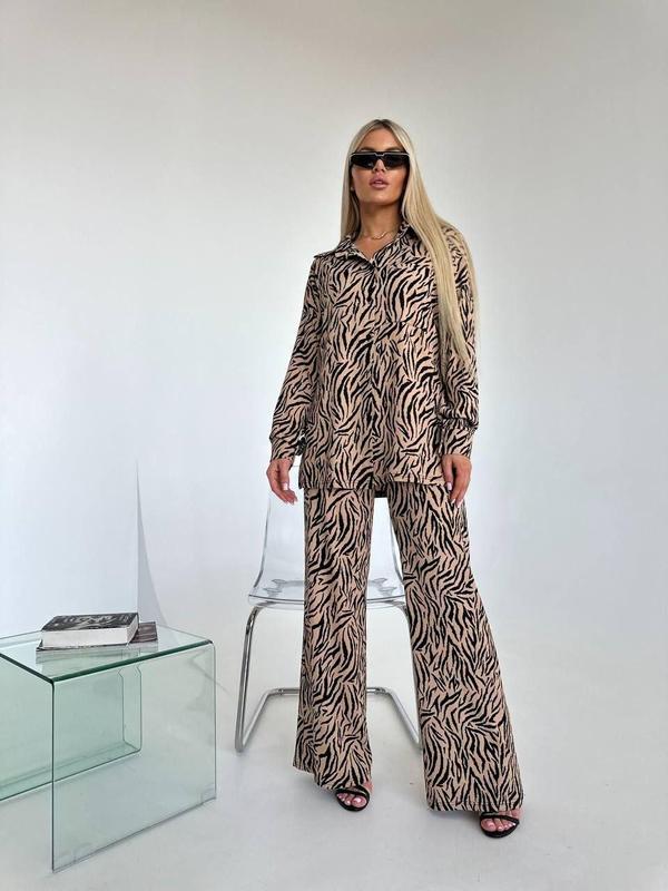 Женский брючный легкий стильный зебровый бежевый костюм двойка рубашка и штаны