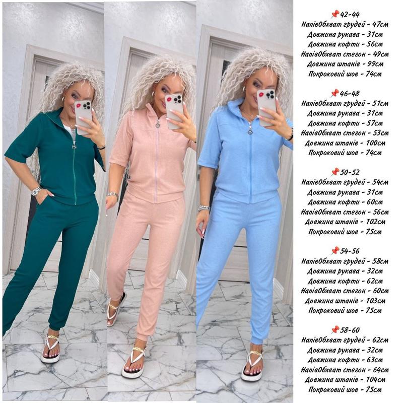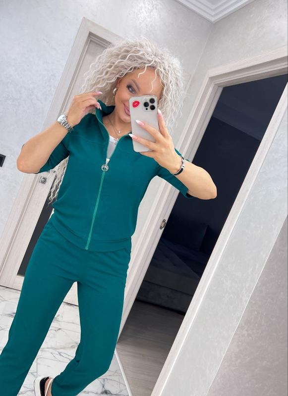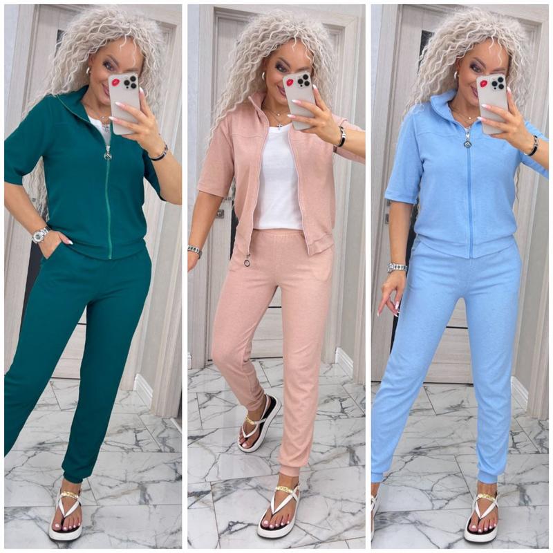 Костюм с брюками на манжете, талия на резинке. Рабочие карманы на брюках.