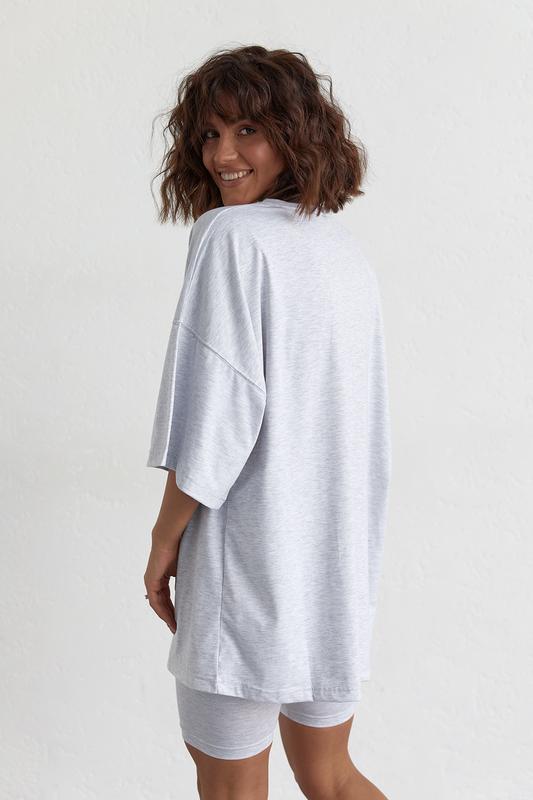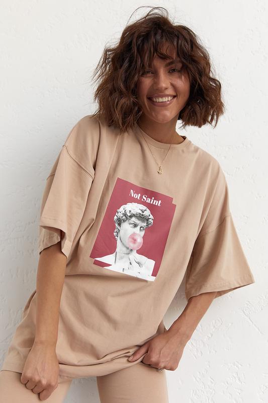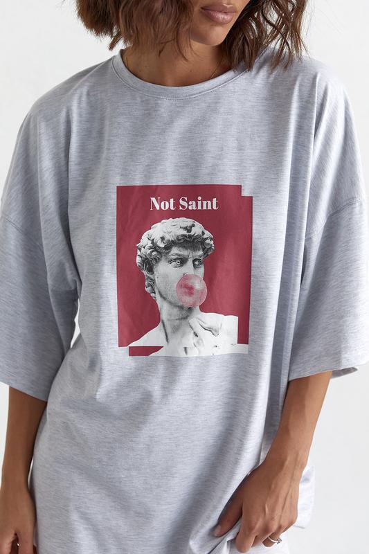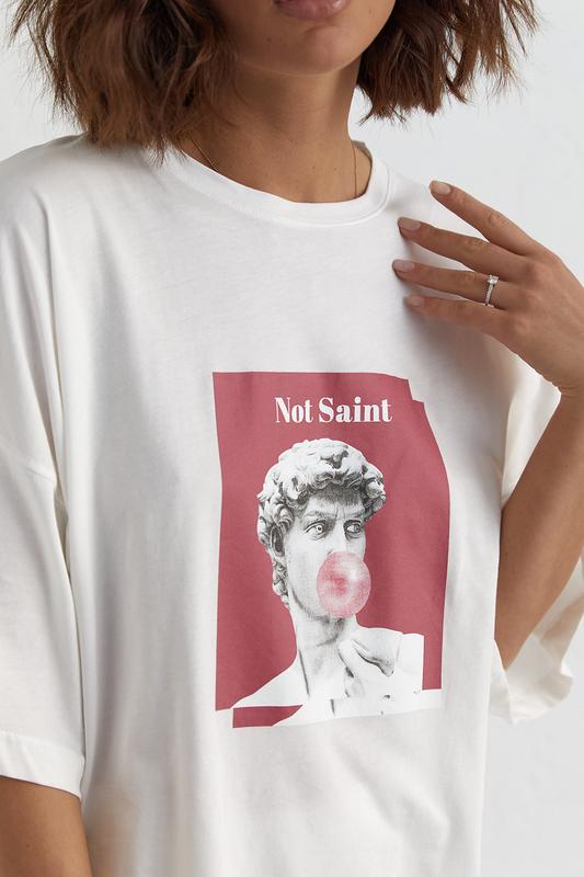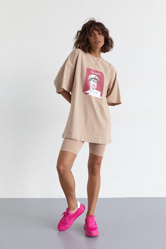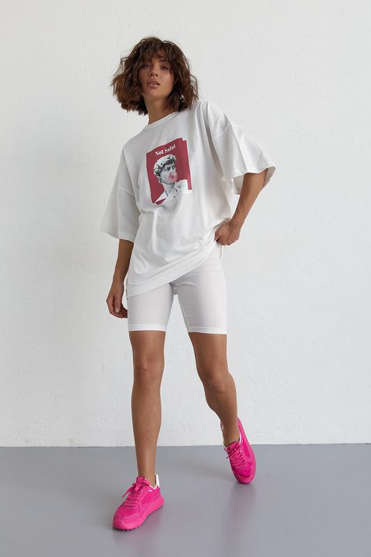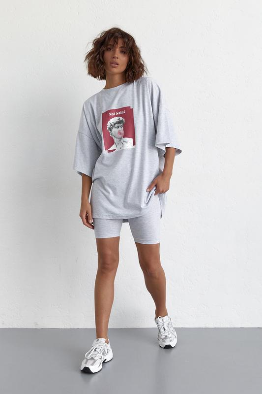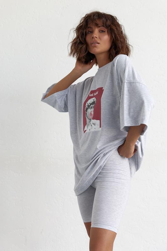 Велосипедные шорты идут с широкой резинкой в поясе. В удлиненной футболке рукава короткие, а круглая горловина обшита узкой окантовкой. На груди футболку украшает принт "Not Saint".
