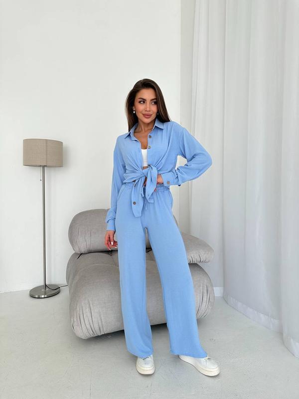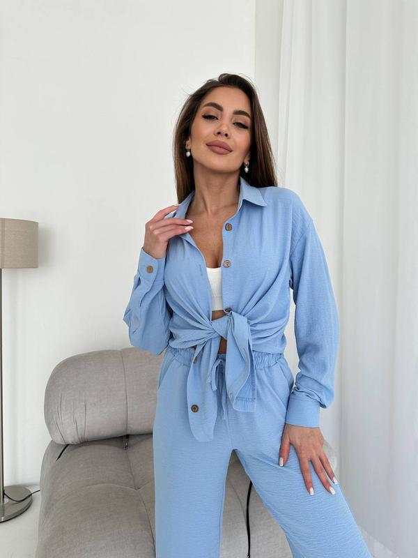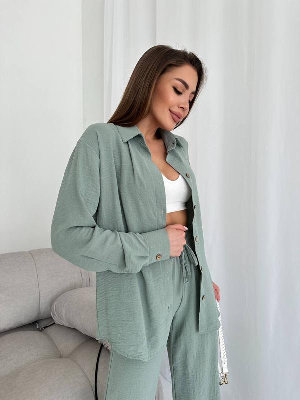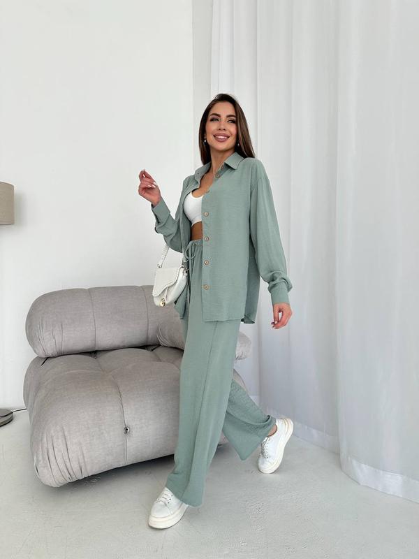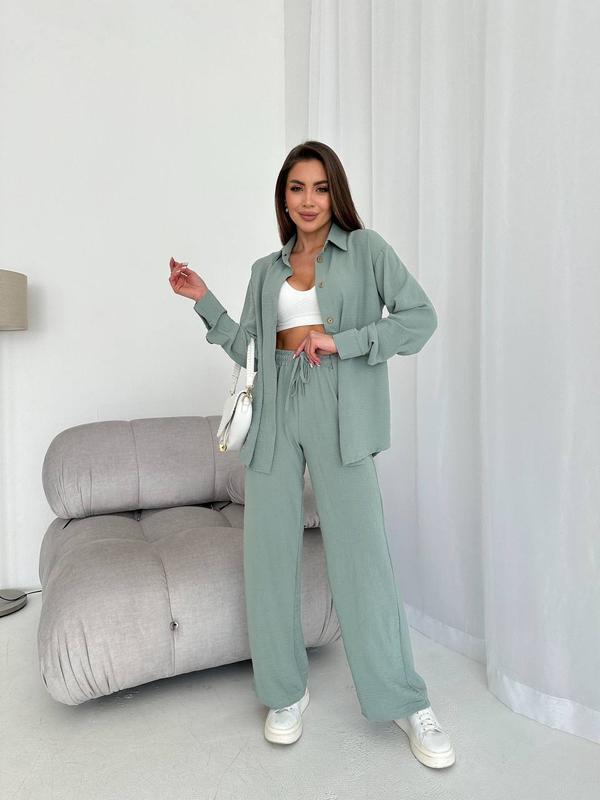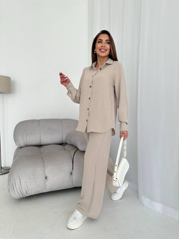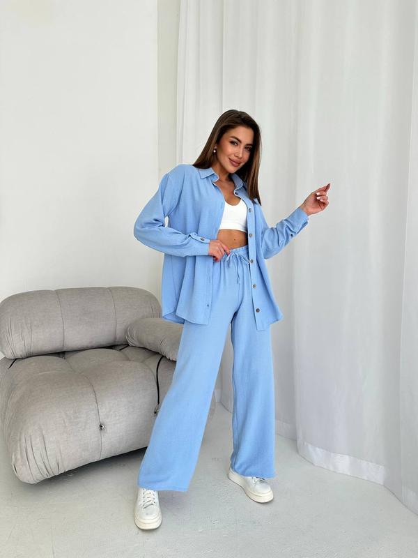 Трендовый костюм жатка с брюками свободного кроя и рубашкой с длинным рукавом