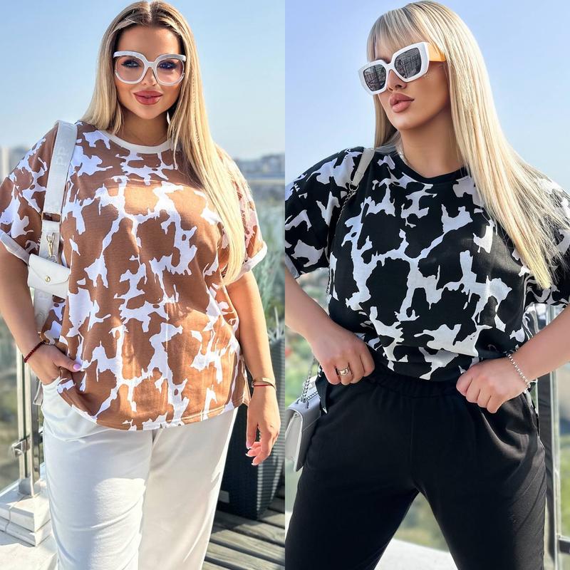 Стильный трендовой спортивный костюм арт. ks. 092 Размеры: 48-50, 52-54, 56-60 Цвета: мягко с белым + молочные бриджи, черно-белая с черными бриджами Ткань: футболка - качественная турецкая двунитка, брюки - красивая двунить пенье Хорошая растяжимость ткани, приятная к телу Стильный и очень комфортный костюм с бриджами. Кофта свободная, сзади немного длиннее, с разрезами по бокам. Рукава кофты спущенные и завернутые (по желанию можно увеличить длину на 5-6 см). Бриджи с карманами в боковых швах на эластичной резинке 4 см. Посадка бриджей выше среднего/высока.