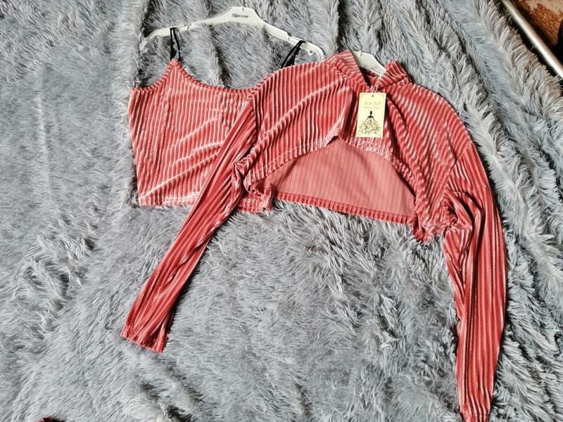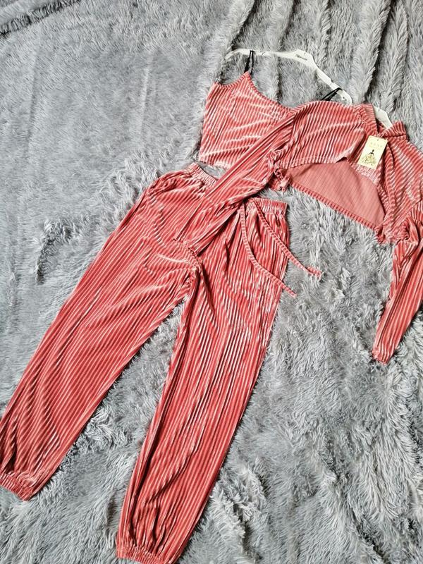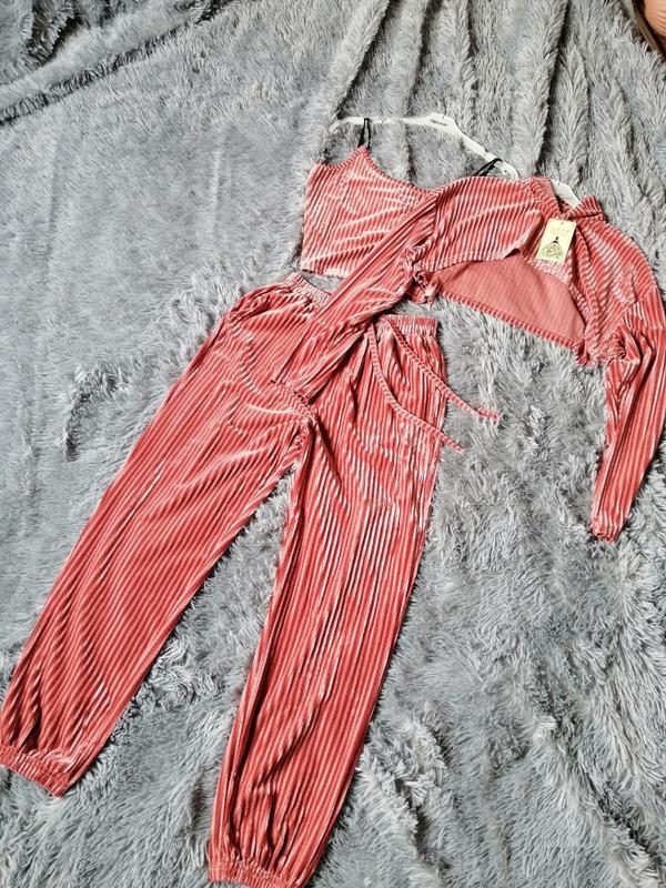 ⛔ стильный крутой костюм в рубчик вельвет велюр тройка штаны джоггеры майка и топ с длинным рукавом
