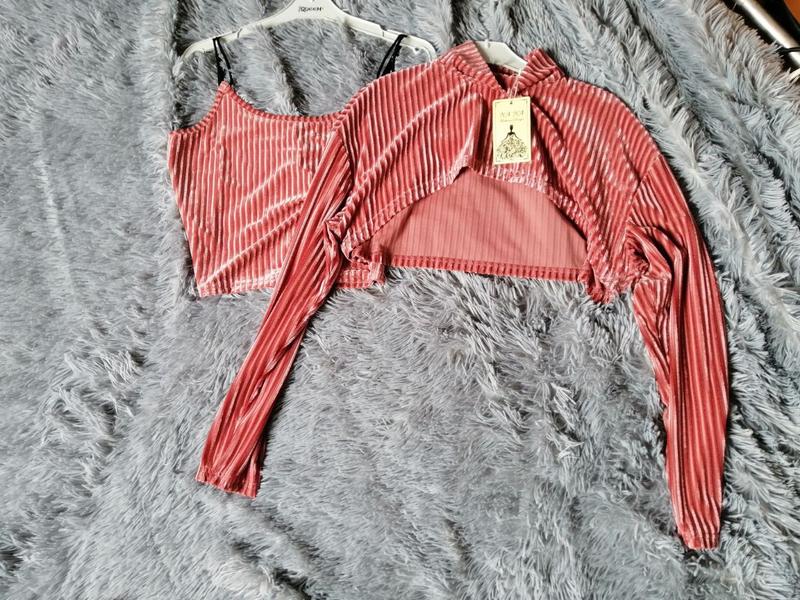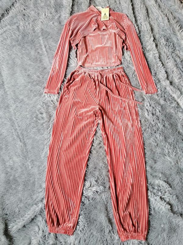 Велюровый костюм тройка брюки джоггеры майка и топ с длинными рукавами в рубчик эффект вельвета