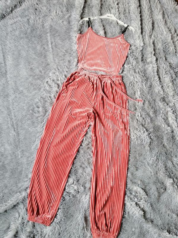 Костюм тройка велюр в рубчик под вельвет топ брюки джоггер и топ с рукавами майка