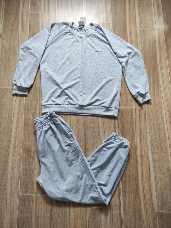 Костюм двонитка, манжети ребана. Талия 32- тянется до 53 см, бедра 54- тянется до 70 см, длина брюк 100/70 см. Ткань хорошо тянется. Замеры еще есть на фото, гортайте