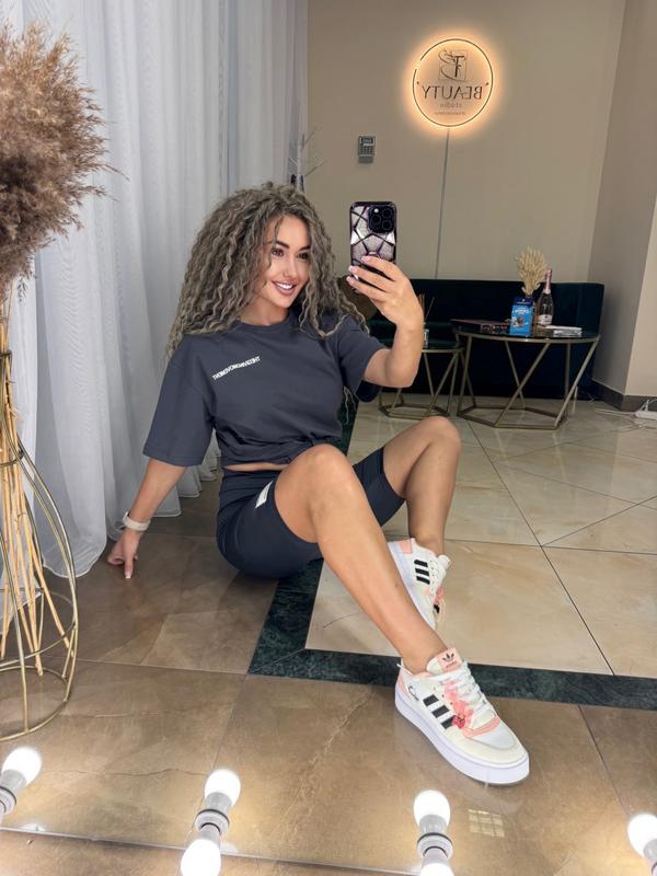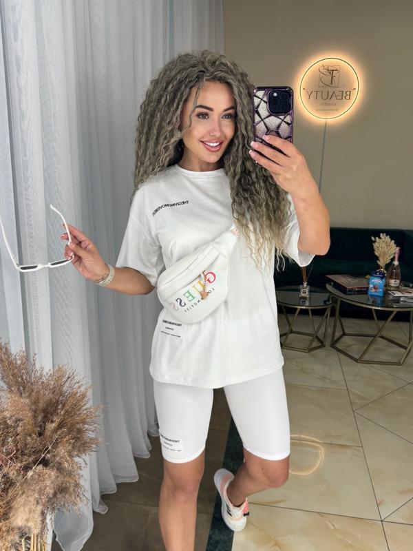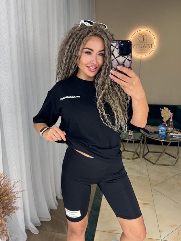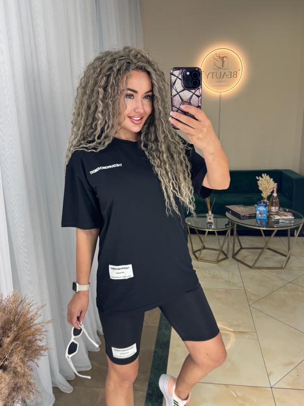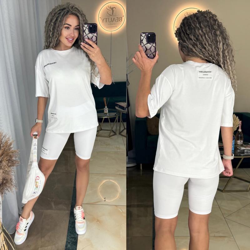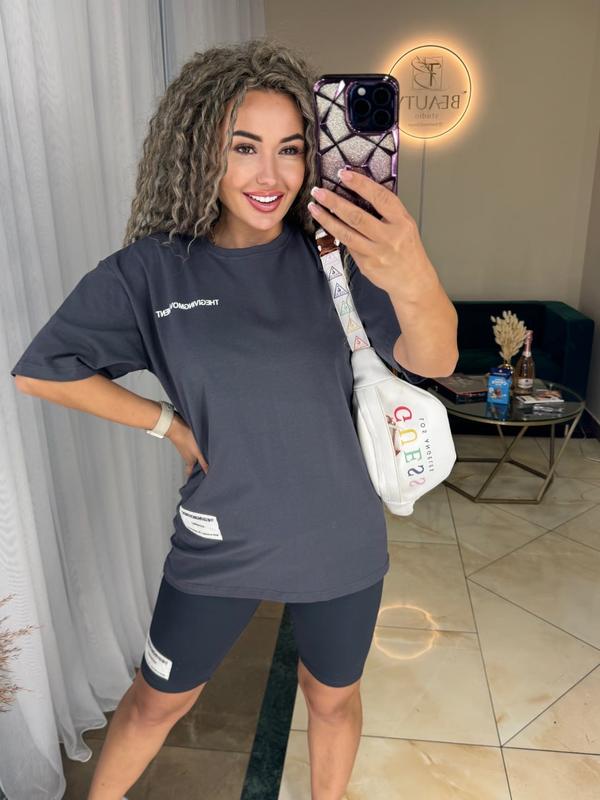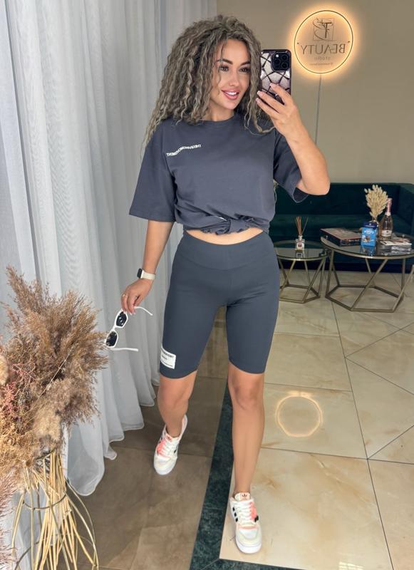 Комфортный классный спортик - футболка и велосипедки. Костюм с нашивками и принтом, очень удобный, готовый повседневный look.