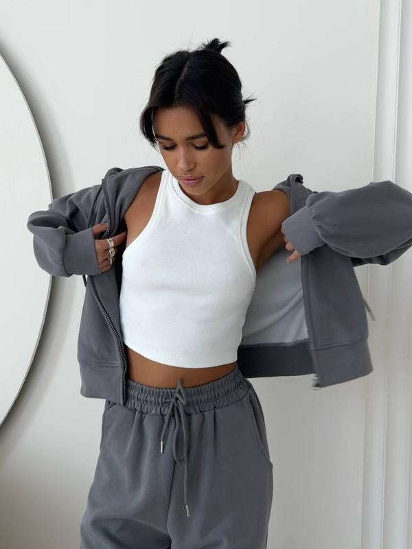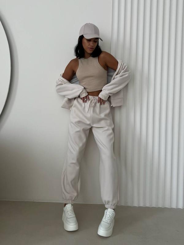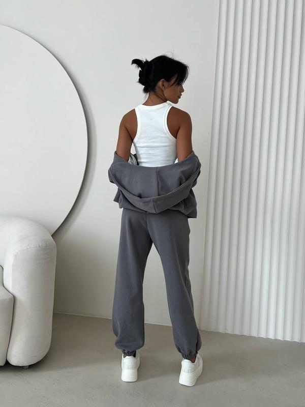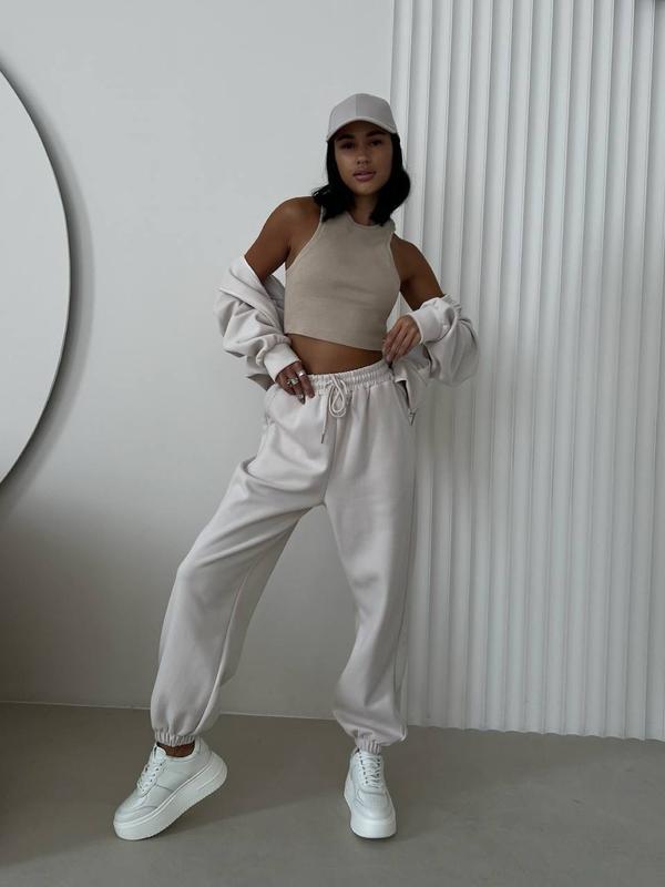 Худи оверсайз с карманом кенгуру, глубокий двойной капюшон, манжеты с основной функцией ткани. Джоггеры высокой посадки, с карманами, на манжетах резиночки.