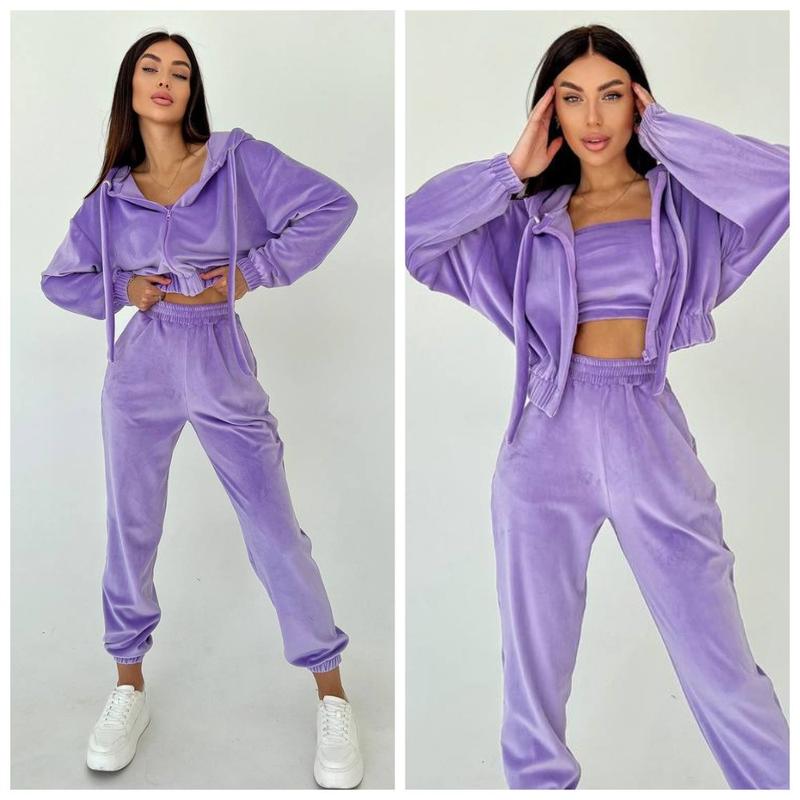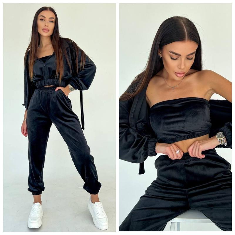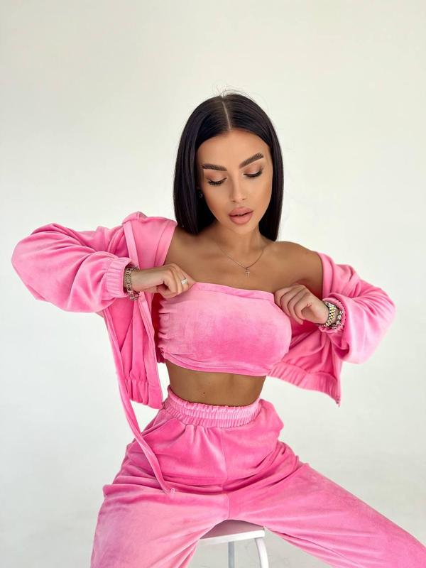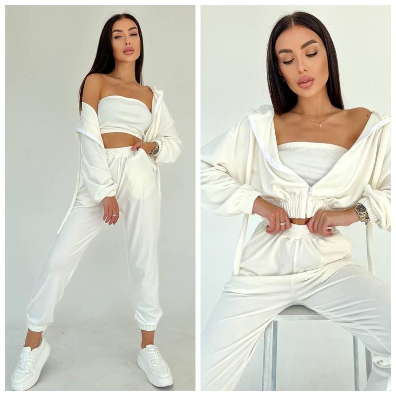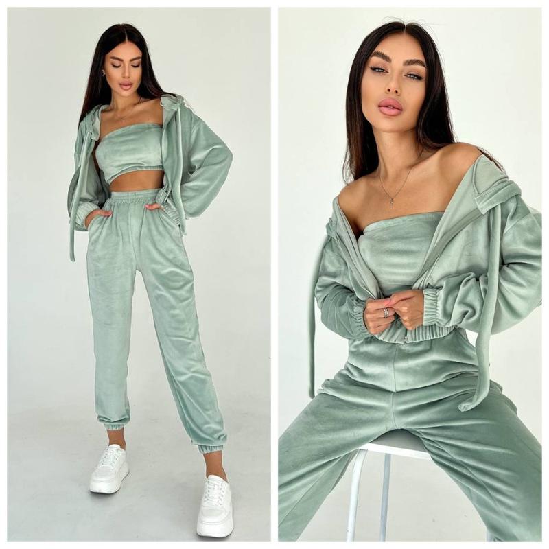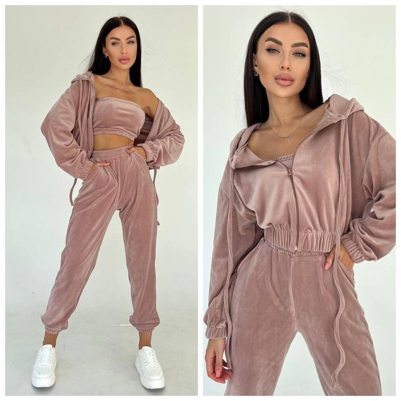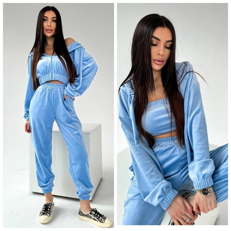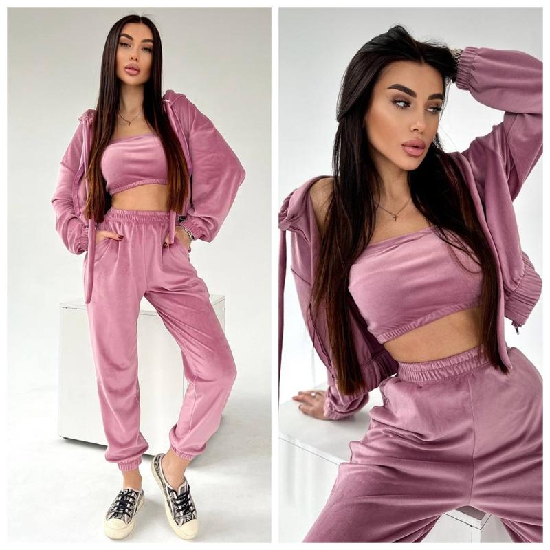 Велюровый женский спортивный костюм тройка худи топ и штаны. Худи свободного