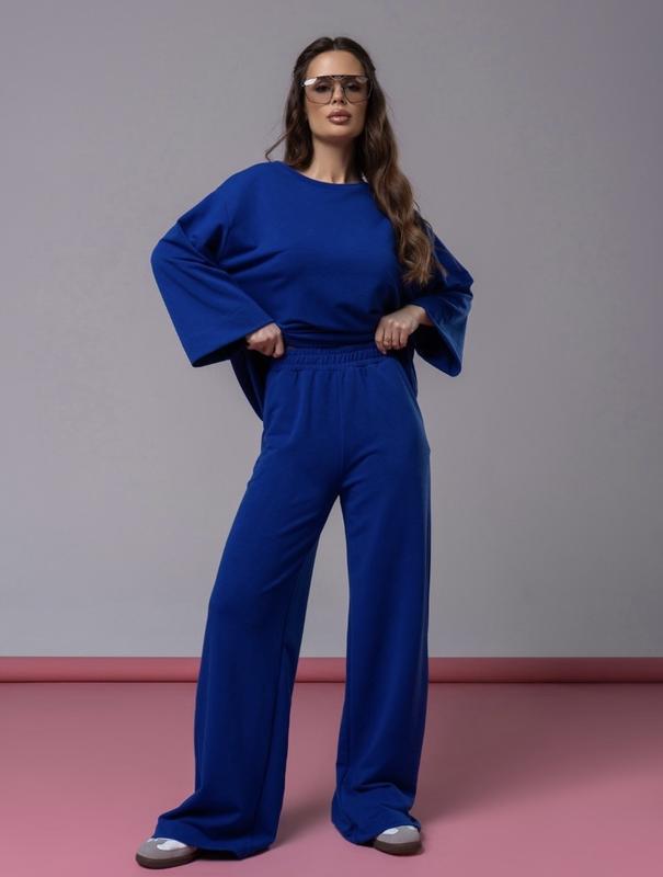 Свободный костюм из двухнитного трикотажа синего цвета. Толстовка кроя оверсайз с длинными рукавами и закрытой горловиной. Свободные брюки высокой посадки с карманами и поясной резинкой.