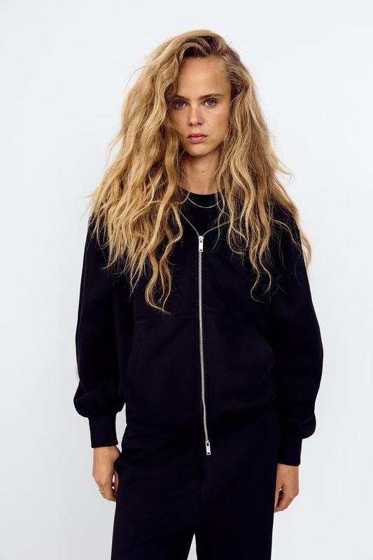 Худи из штапельного хлопка с длинными рукавами с манжетами и застежкой на металлическую молнию спереди.