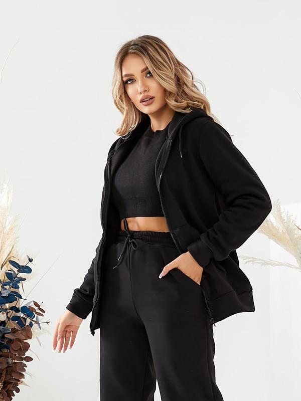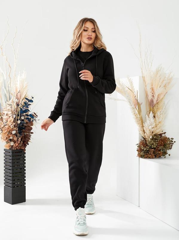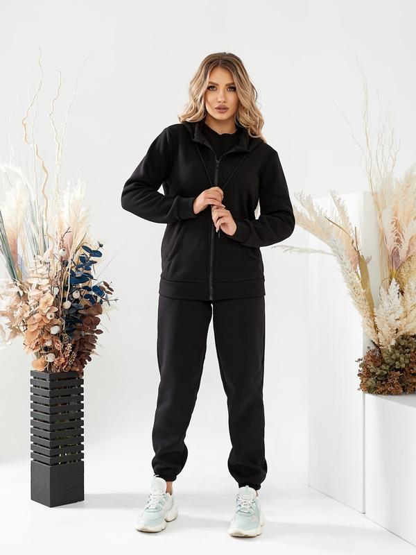 Кофта свободного кроя с капюшоном и карманом кенгуру, застегивается на молнию. Брюки на резинке, 2-е карманы.