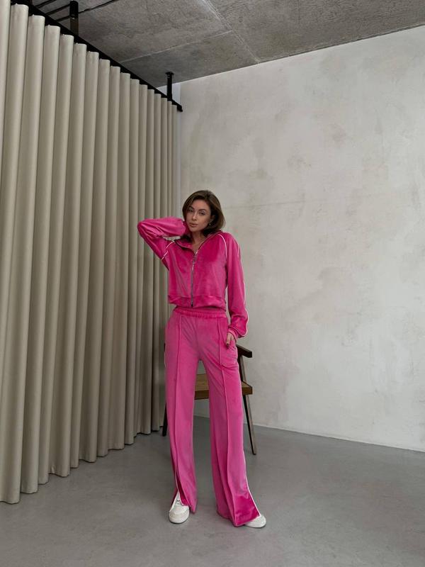 Спортивный велюровый костюм кофта на молнии и широкие брюки с разрезами на штанине