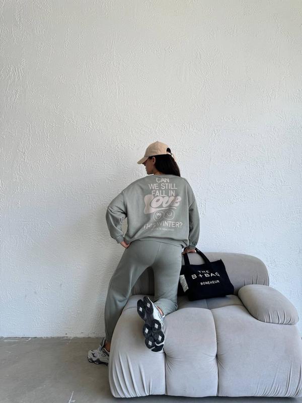 В комплекте штанишки идут с широкой резинкой на поясе, а внизу с манжетами на резинке. Спереди, под одним из прорезных карманов, расположен небольшой принт. В свитшоте круглая горловина обшита окантовкой, проймы опущенные, прямой низ и длинные рукава заканчиваются манжетами. Спереди на кофте нанесен такой же принт, как и на брюках. Спинка свитшота украшена крупным принтом.