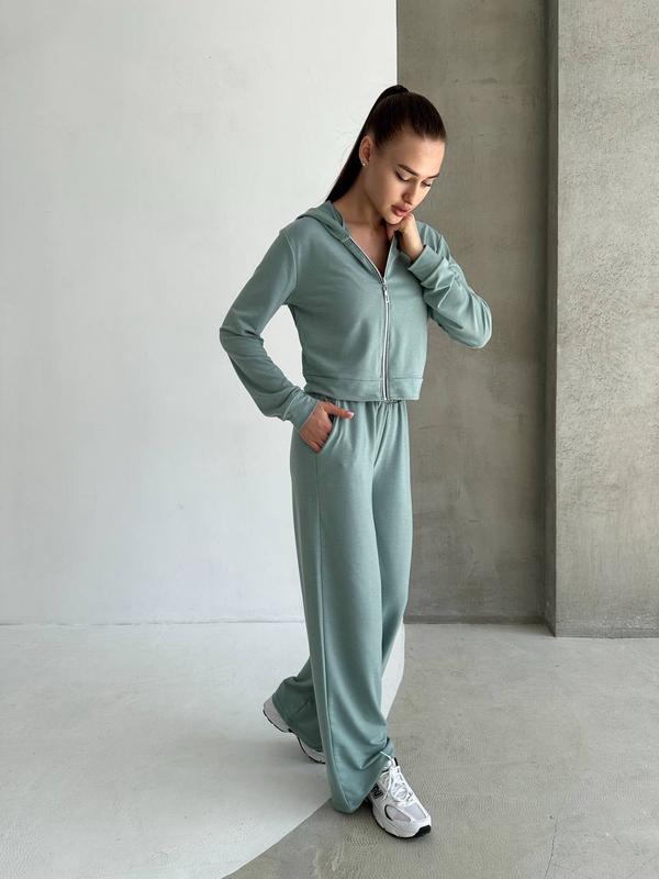 Женский спортивный костюм двунить с широкими брюками на высокой посадке и кофтой на молнии...