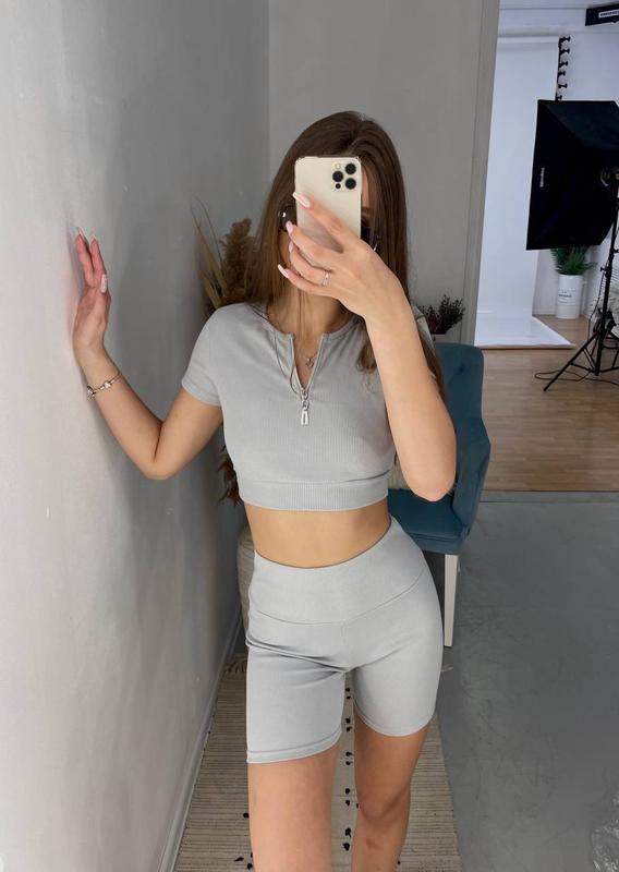 Женский спортивный прогулочный костюм двойка короткий топ с коротким рукавом на молнии и в...