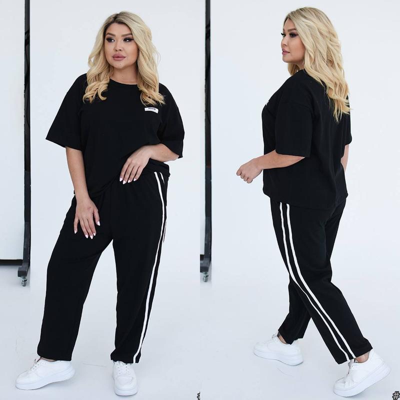 Костюм двойка Модель 117 Размеры:50-52, 54-56,58-60 Ткань: кулир турецкий Очень качественная ткань! Не кашлатится и не линяет,легкая и приятная к телу! Цвета:черный,графит, трава Брюки -на резинке, с двойным лампасом и с карманами! На футболке стильная нашивка! На моделях размер костюма: 50-52 Будь всегда стильной! Замеры : ОГ - 118, 128, 136 см Рукав от плеча- 22,22, 22 см Длина футболки по спине:65, 66, 67 см ОС - 120,128, 142 см ОТ-74, 80, 90 см( резинка) Длина брюк - 94, 96, 96 см Внутренний шов - 64, 64, 64 см