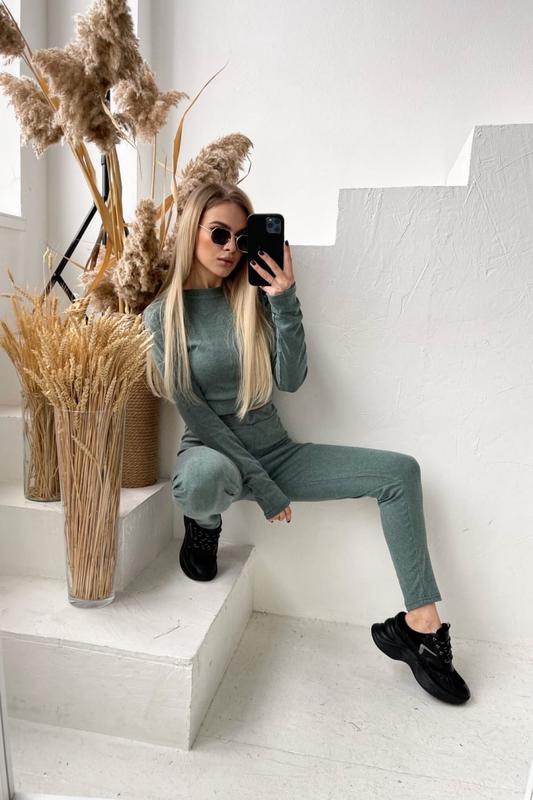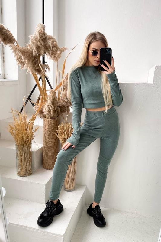 Стильный костюм из плотного джерси. Укороченная кофта-топ с длинными рукавами. Прямые брюки с хорошей посадкой, пояс на резинке.