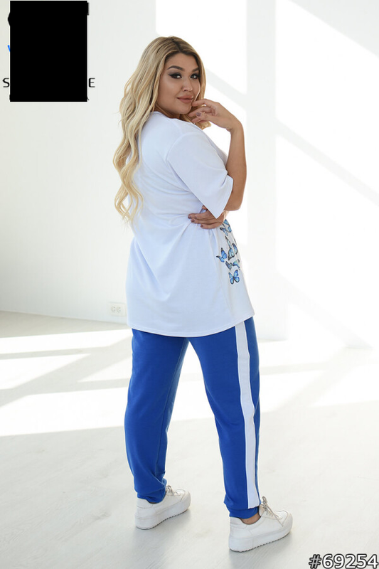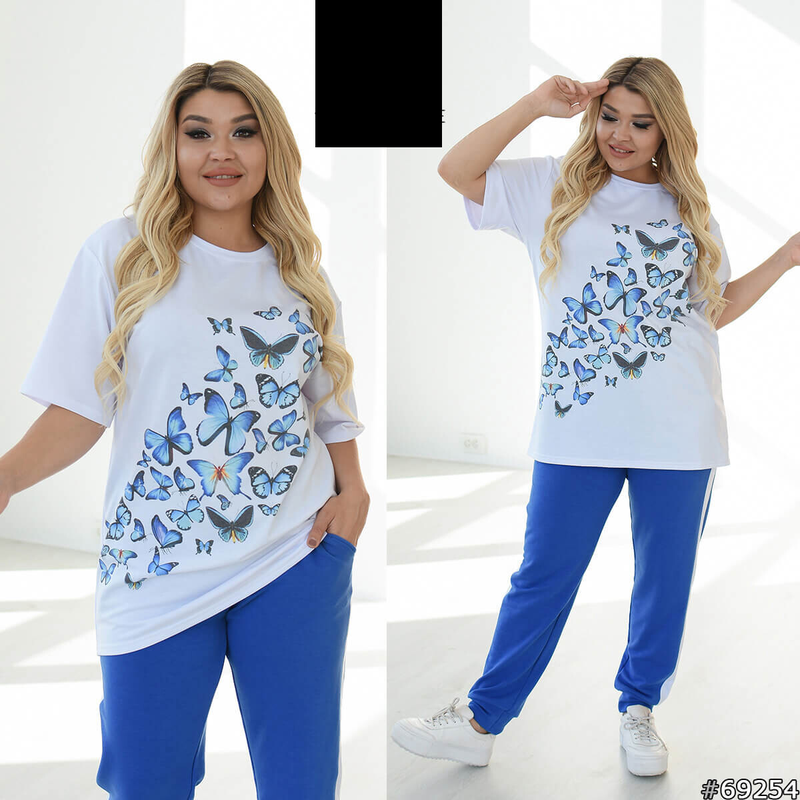 Яркий стильный с летним принтом прогулочный костюм подарит комфортное времяпровождения на прогулке, утренней пробежке или отдыха на природе. Комплект выполнен из мягкой ткани и состоит из футболки и спортивных штанов. Футболка удлиненная свободного силуэта с короткими рукавами и круглой горловиной, на передней полке украшена ярким накатом бабочками. Брюки с удобной посадкой, которую обеспечивает мягкая резинка в поясе и эластичные манжеты внизу. Контрастные лампасы в тон футболки украшают боковые швы и визуально удлиняют силуэт. Растяжимость ткани средняя.