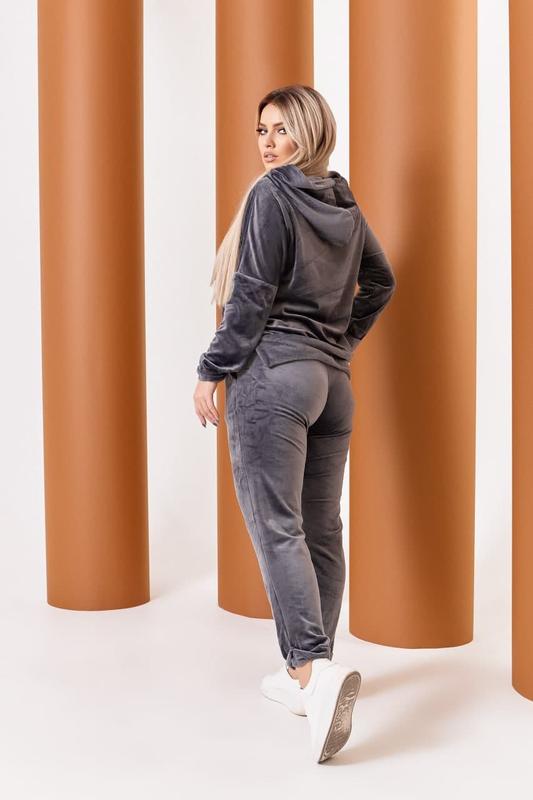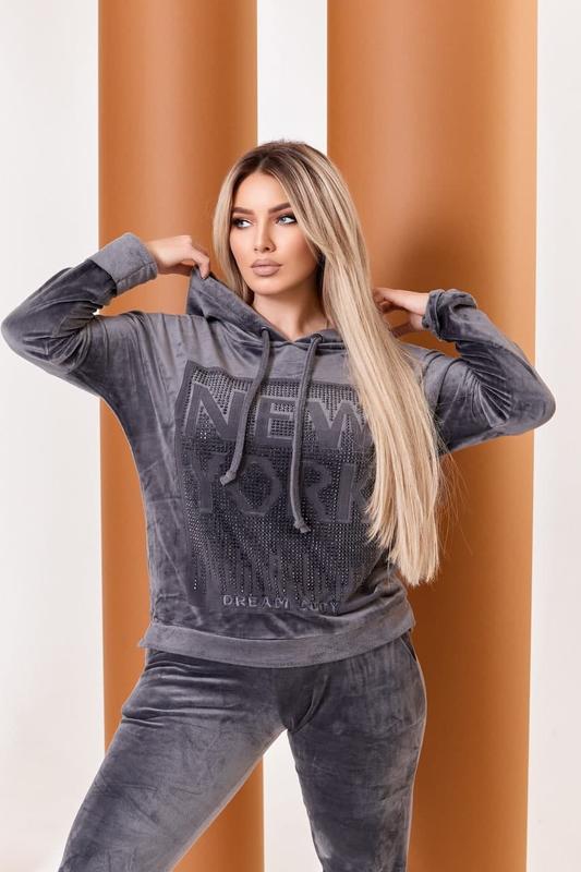 роскошный спортивный велюровый утепленный костюм со стразами и аппликацией, качественное исполнение, ткань - турецкий велюр, хорошо ложится по фигуре, смотрится костюм очень нарядно и стильно, цвет серый графит, камни на кофточке черные.