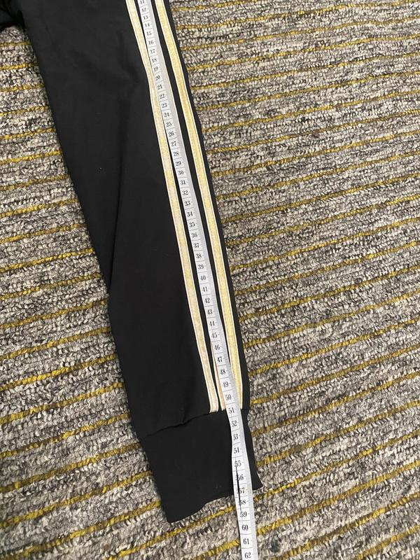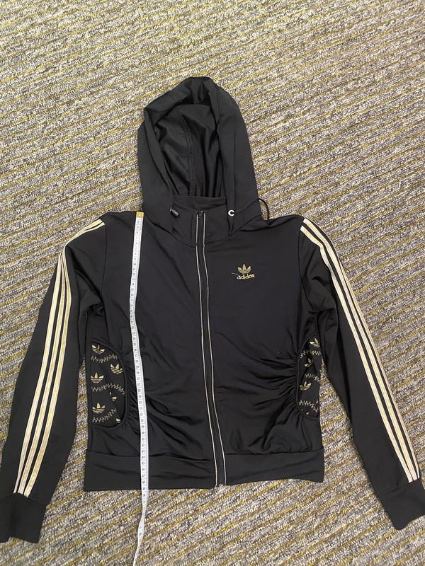 Без дефектов. Немножко посветлели золотистые полоски. Ткань - масло, хорошо тянется и садится по фигуре. Штаны клешевые. Кофта с карманами, на замочке, с капюшоном