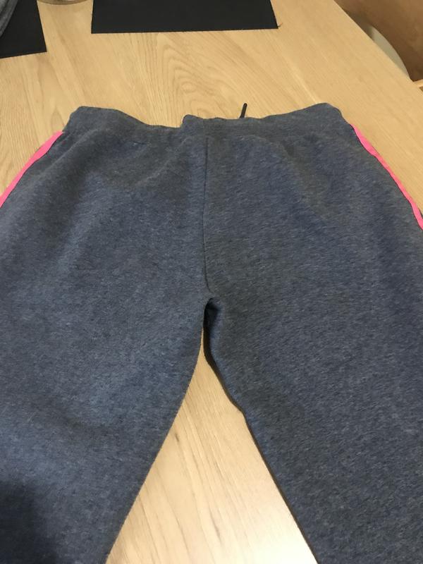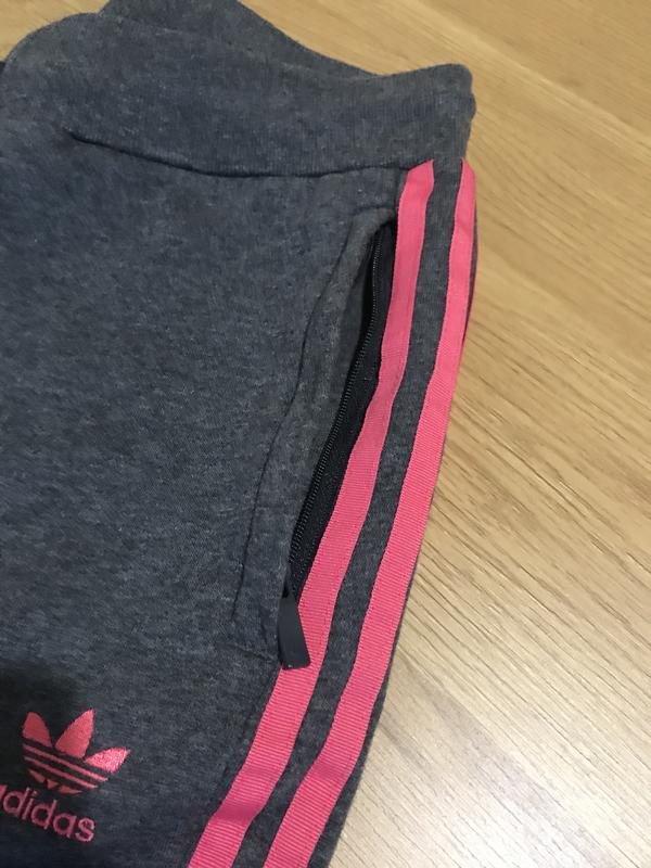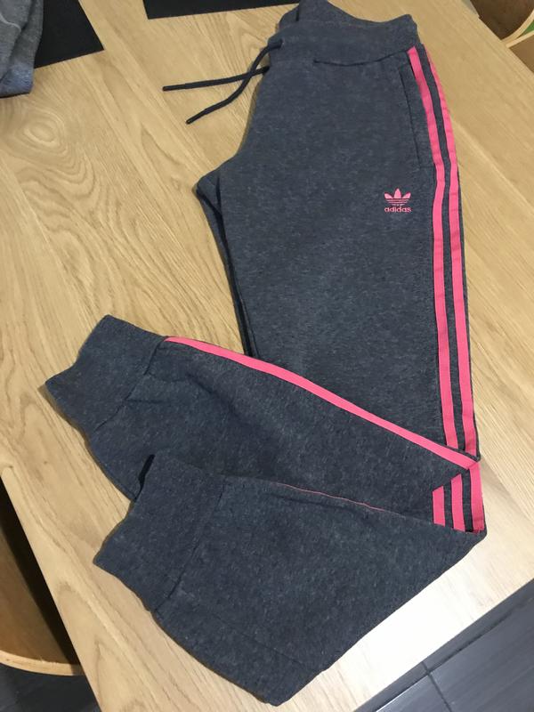 Теплые сприборные брюки adidas, серые с тремя поломками розовыми больше к малиновому, карманы на молнии, манжеты, замеры - в талии 40 см, тянется до 49, бедра 54 см приглянется до 63, шаговый -79см, длина - 101 см
