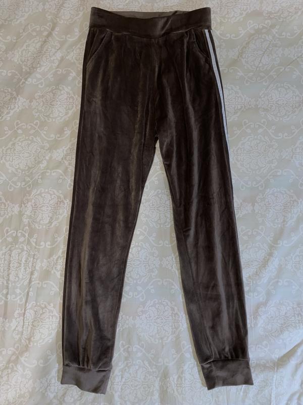 Женские спортивные штаны, теплые, коричневого цвета, 2 кармана, высокой посадкой, по 2 белые полоски по бокам штанин, в поясе на резинке. Талия - 34см, бедра - 57см, длинна штанины - 97см. Пишите в личные сообщения, отвечу на все вопросы, по желанию дополню фото