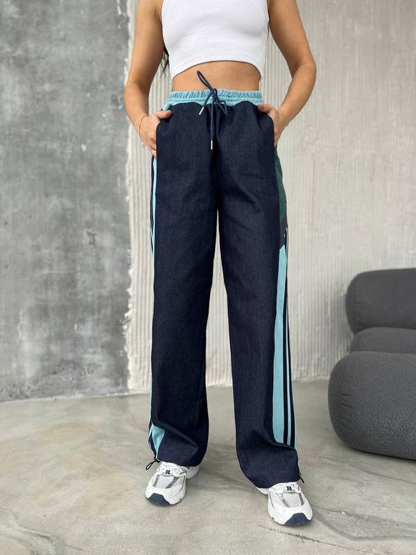 Актуальні комбіновані джинсові брюки з лампасами мають по бокам трикотажні вставки , дві зручні кишені , низ на кулісці .🔥
