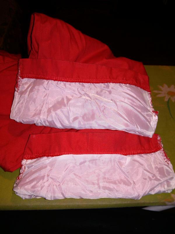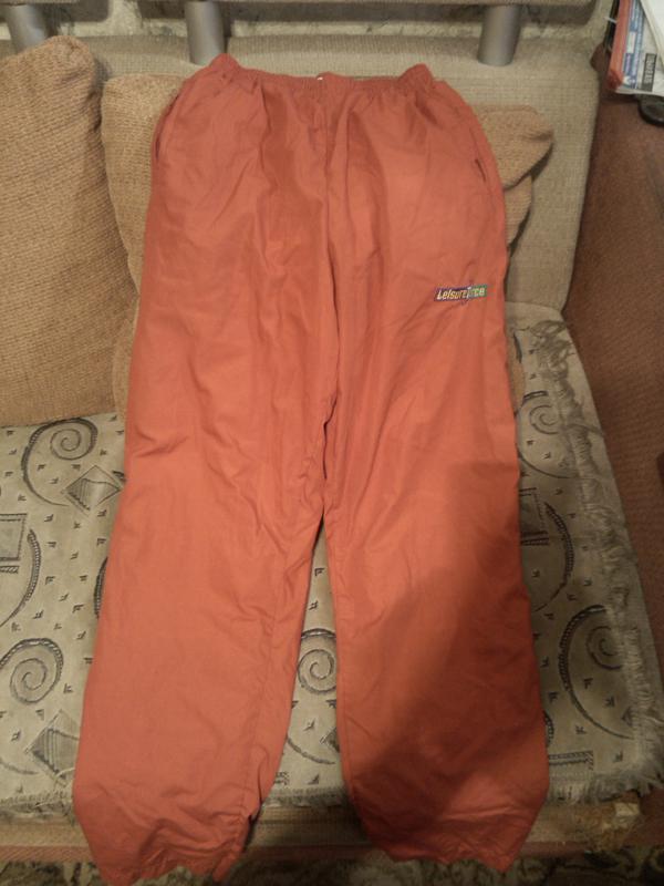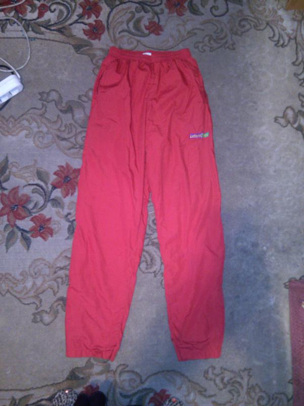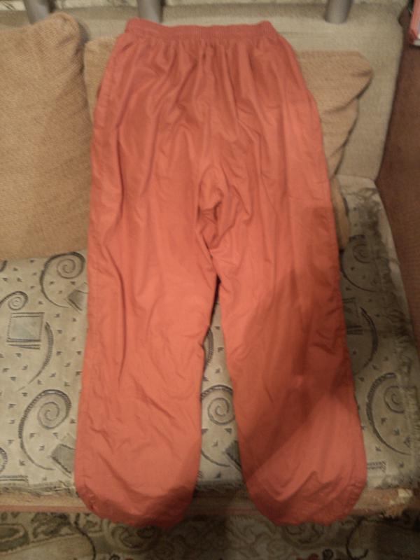 Спортивные,яркие,красные -(ярче, чем фото 3)брюки-штаны с карманами.Внутри есть подкладка.Размер L,но ориентируйтесь по замерам:ПОТ 30см в сжатом состоянии резинки-тянутся до ПО 54см , ПОБ 5/57см, длина внешнего шва 108см, внутреннего 80см, передняя посадка 33см,задняя посадка 40см.