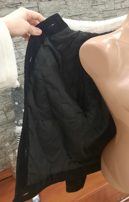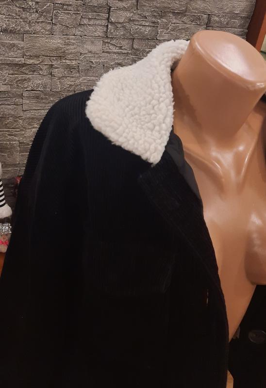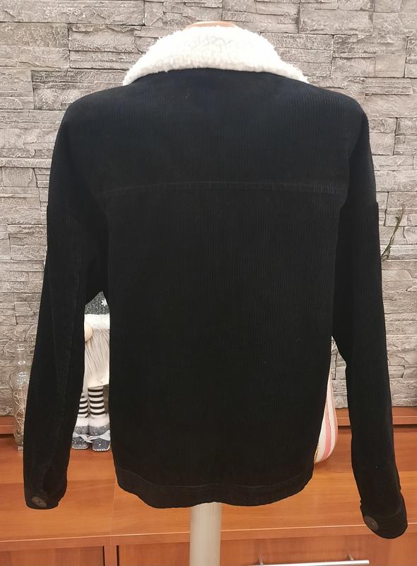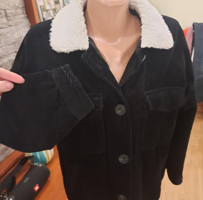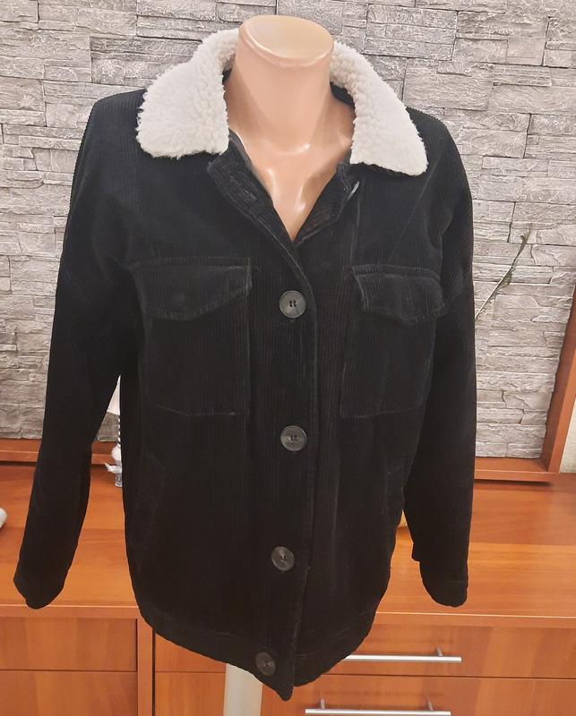 Тепла вельветова куртка на підкладці із синтепону та білим коміром тедді в ідеальному стані.Чорний не витертий колір, дуже гарна та модна.Єдине,що в середині одного карману є незначне пошкодження підкладної тканини.