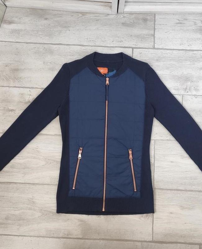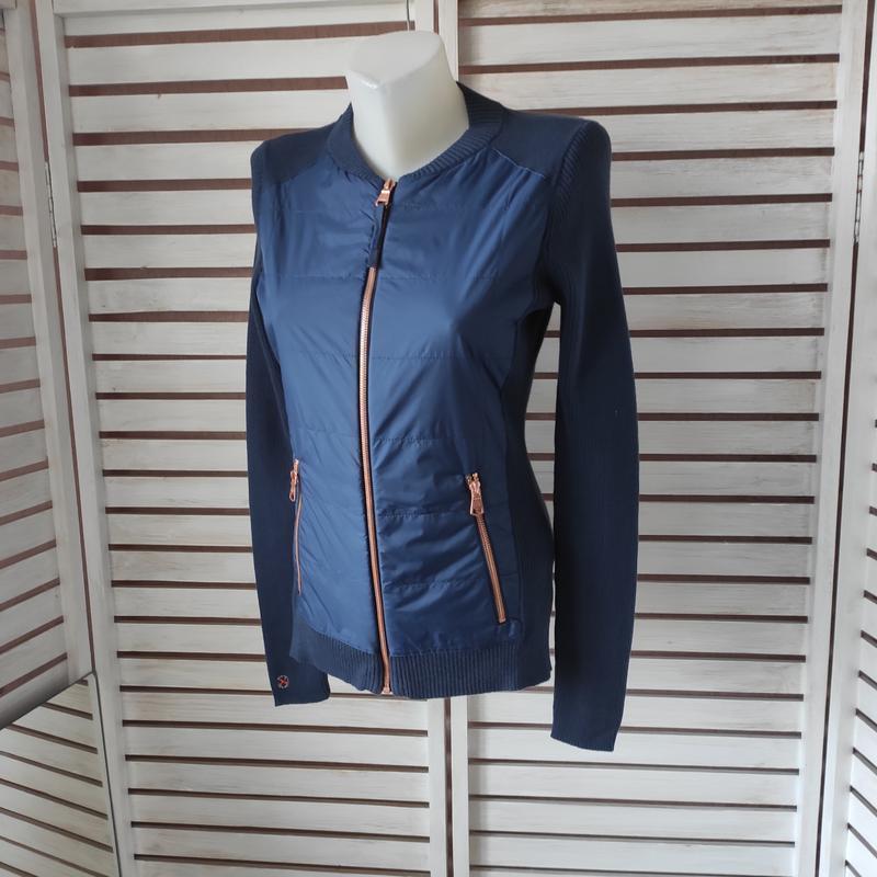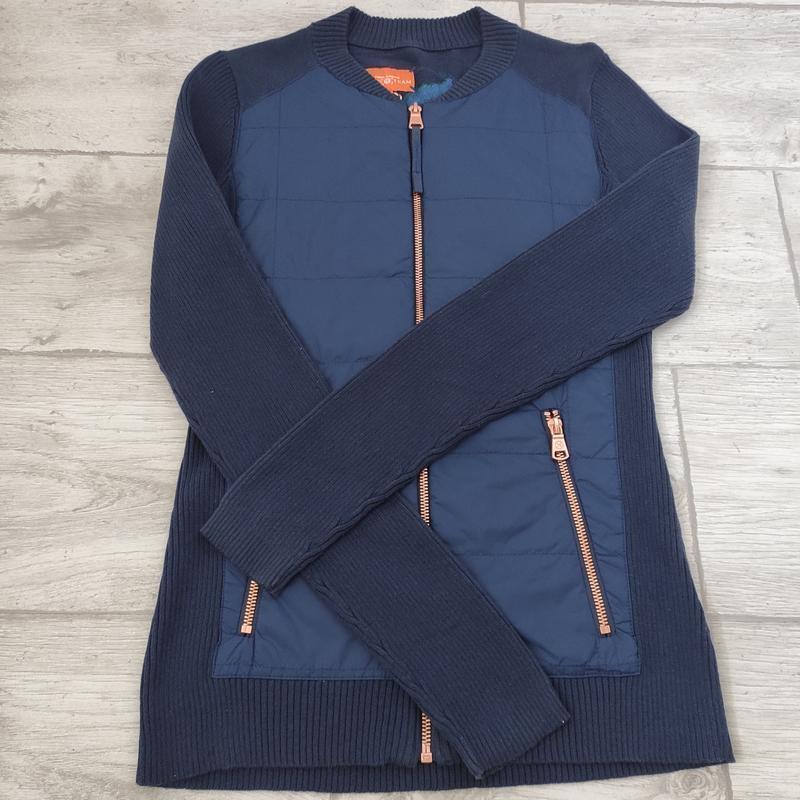 Крутая комбинированная, кофта на молнии от немецкого бренда "Tom Tailor". Перед выполнен из плащевки плотной, спинка и рукава - трикотаж. Цвет темно-синий. Молния медного цвета. Размер указанный XS, но более подходящий на S. Высокое качество.