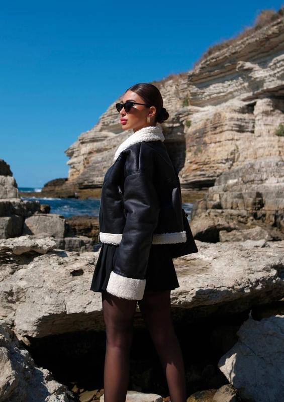 Трендовая женская куртка-авиатор с меховой отделкой, выполненная из эко-кожи premium класса: классический воротник с лацканами, длинный рукав с широкой манжетой и два вместительных кармана на молнии.