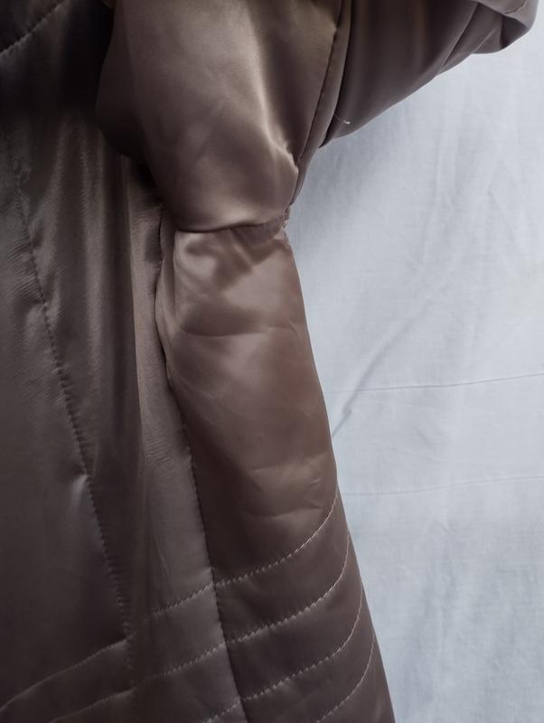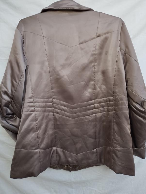 Женская куртка утеплина, на осень, весну, теплую зиму.Верх из шелковистой ткани. По бокам потайные карманы на молнию.Рукава с манжетами, что позволяет удлинить их. В средние подкладка, есть карман.Куртка по весу легкая.Застежка на молнию и кнопки, все работает.