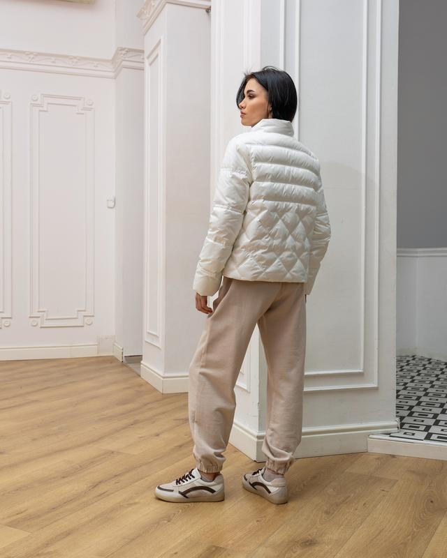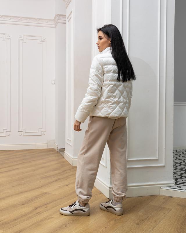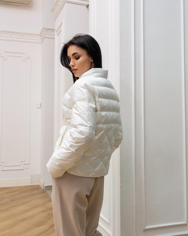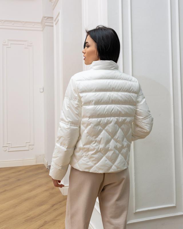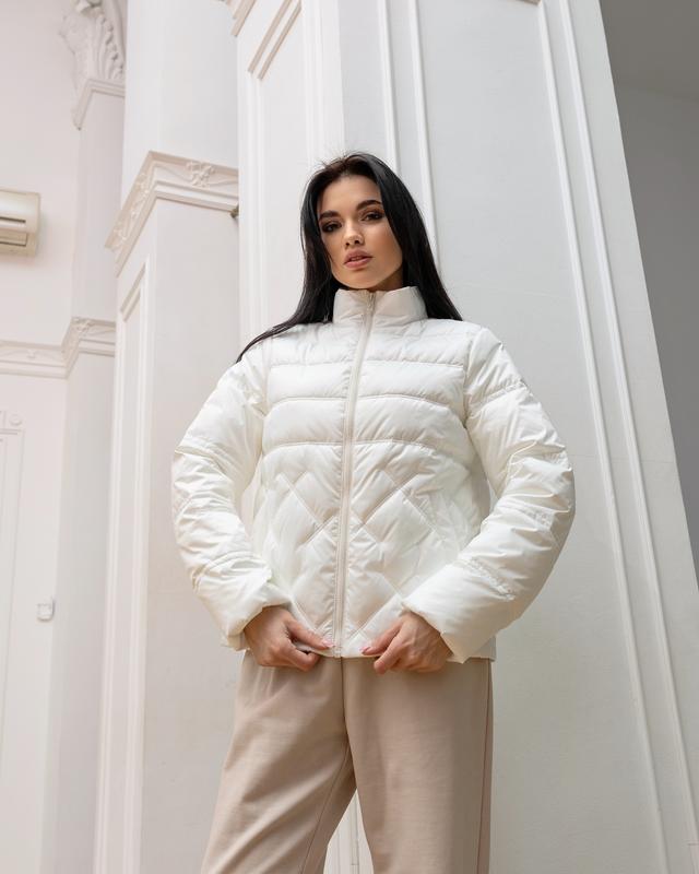 Демисезонная короткая стеганая куртка выполнена из водоотталкивающей плащевки и утепленная биопухом.