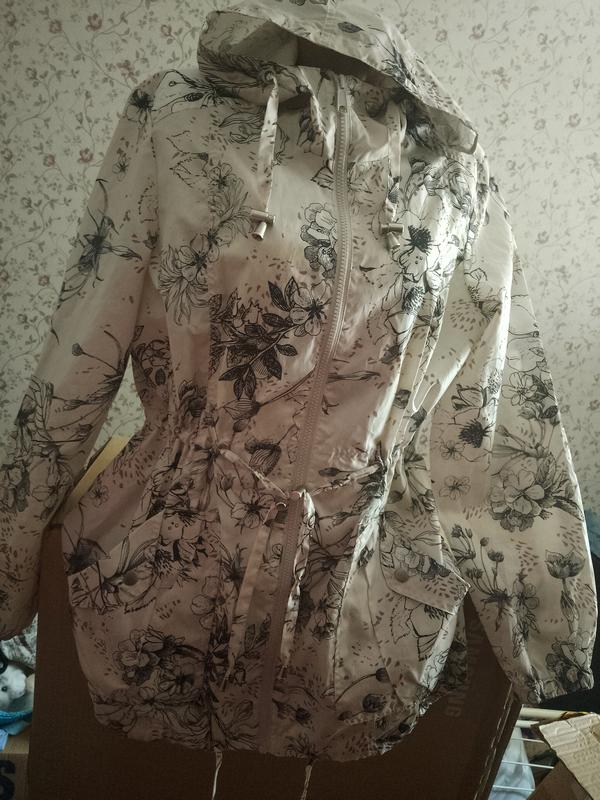 тонкая ветровка в идеальном состоянии,основной цвет светлый беж с цветочным принтом указан размер" м"-свободно но можно до 50 (хл) есть карманы,пояском затягивается, капюшон не съемный замеры сделать по-вашому запрос