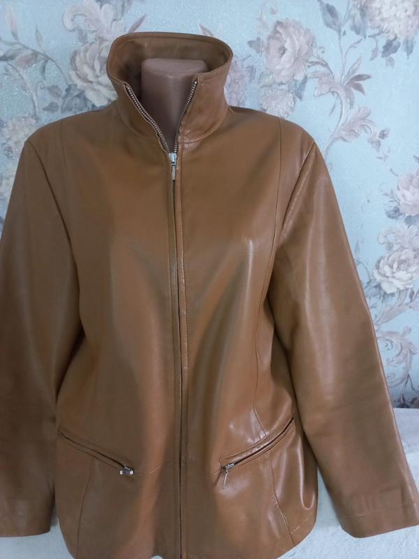 Куртка женская из качественной очень емкой кожи, облик новой вещи, но имеет пару незаметных и незначительных нюансов указанных на последних двух фото. Имеет три кармана на молниях, крой прямой, цвет приятный базовый. Длина 65см, плечи 44, пог 53, рукав 56
