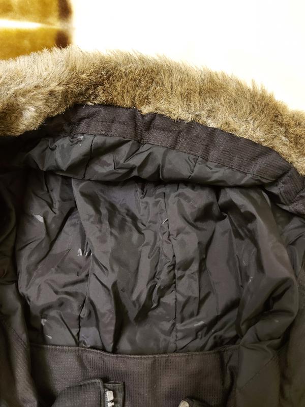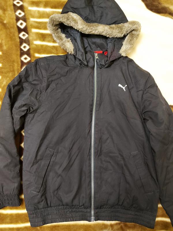 Куртка унисекс на молнии, с утеплителем, внизу изделия и на рукавах резинка, 2 кармана, капюшон отделан искусственным мехом, капюшон крепится на кнопках, отстегивается, подкладка и фурнитура молнии брендированы. Размер 12. Замеры ПОГ 51 см, длина рукава 56 см, длина изделия 57 см. Бирка с составом срезана. Состав предположительно полиэстер.