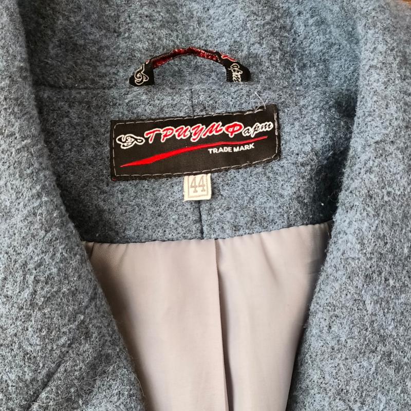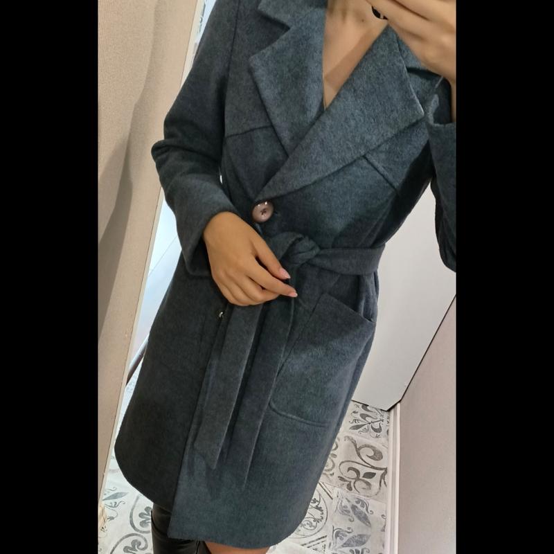 Пальто темно-серого цвета на подкладке с поясом, ткань очень плотная.