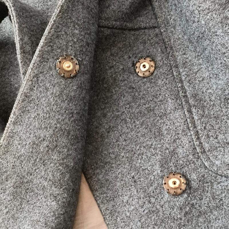 Застегивается на большую пуговицу, внутри имеет две кнопки (одна кнопка отсутствует, можно пришить).