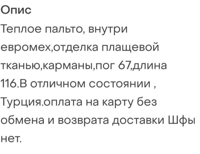 Шикарное пальто,в идеальном состоянии,батальная серия.Шерсть валая с отделкой плащевкой,на еврохете.Е карманы,на замке и кнопках. Качество люксовая,производитель Турция,модное,современное,гарное, дизайн деталей.Пог 67,длина 116.Оплата на карту, без обмена и возврат.