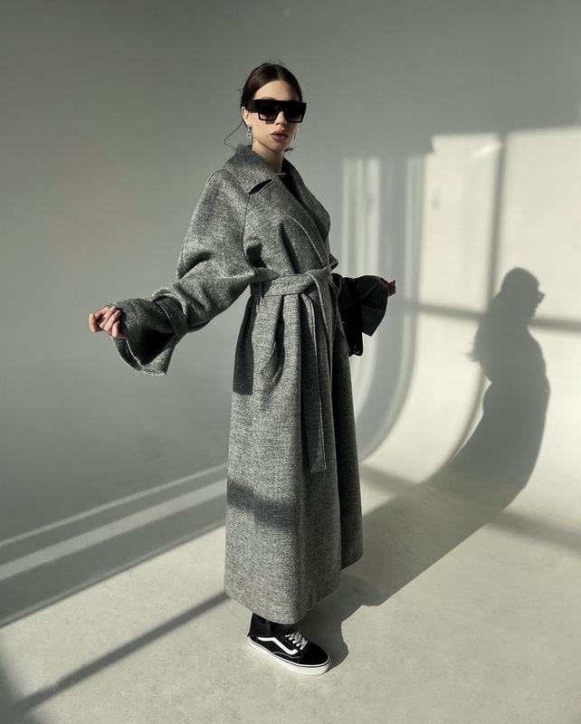 Серое шерстяное оверсайз пальто макси кимоно в стиле max mara